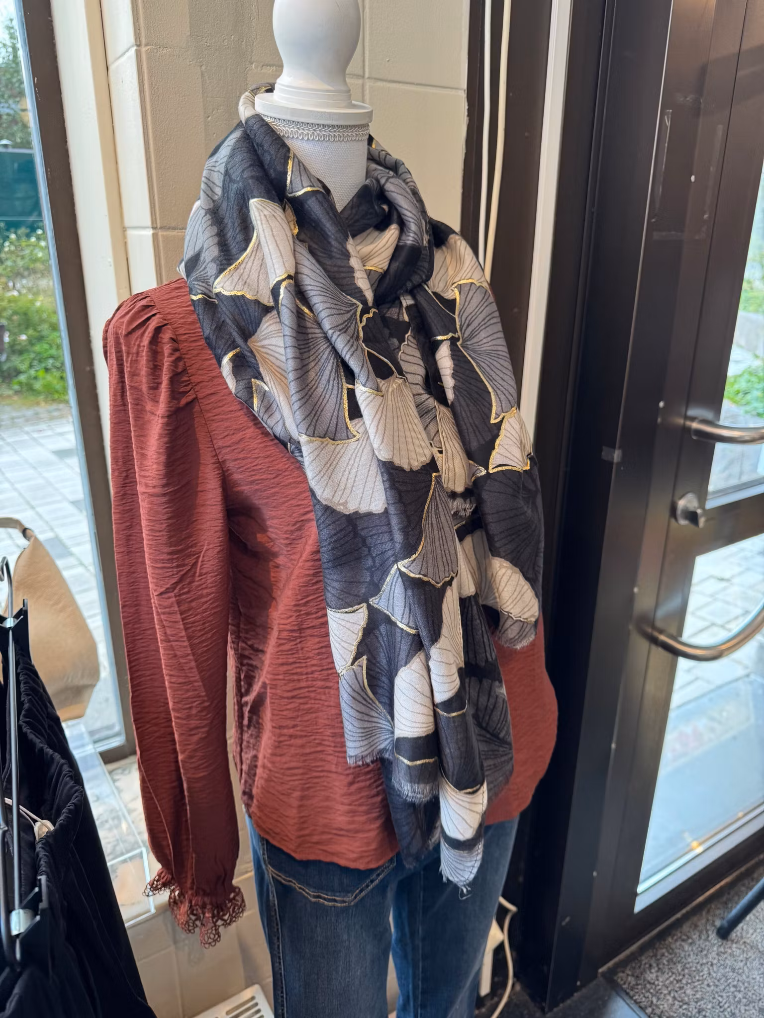 Härlig scarf i fint mönster i grå och svart med diskreta inslag av guld.