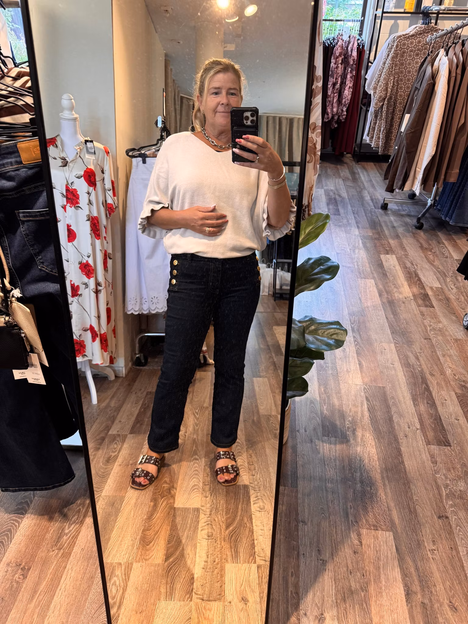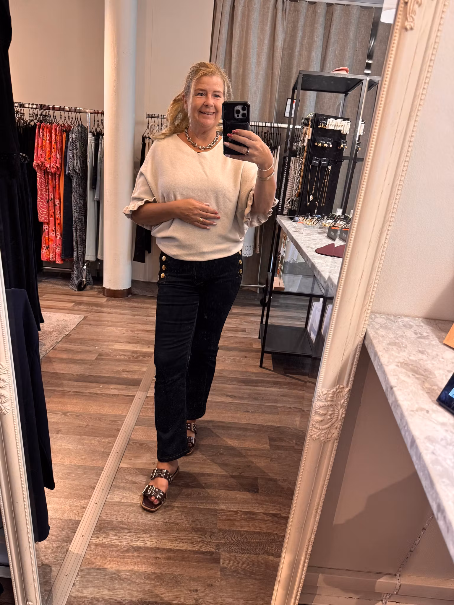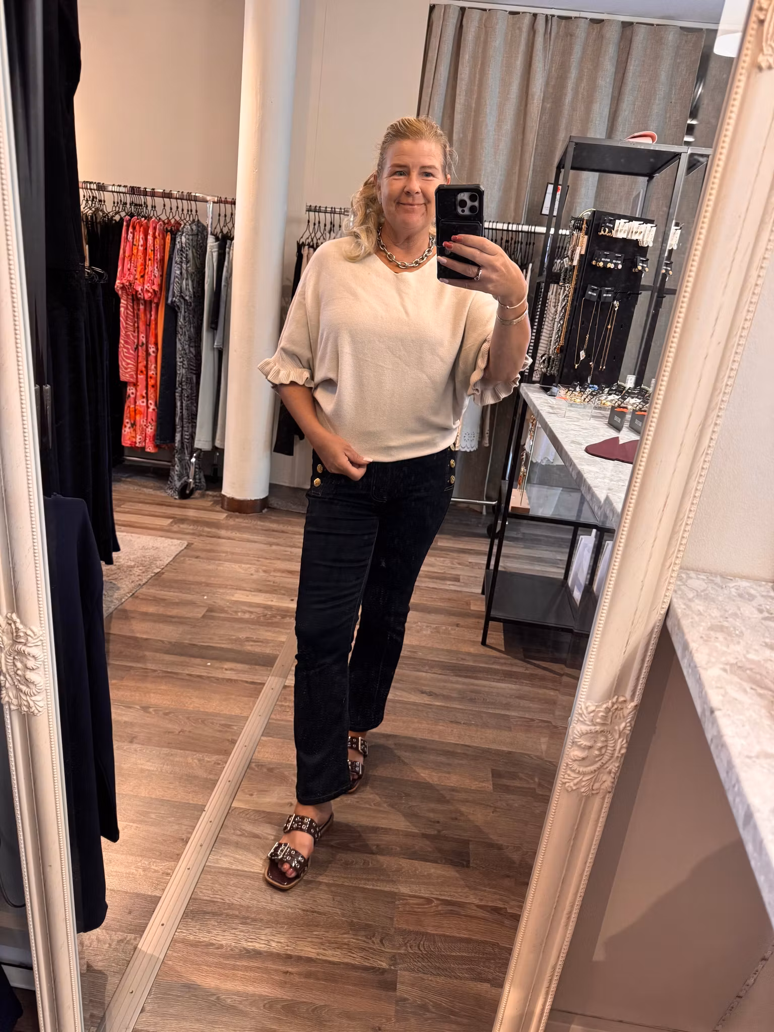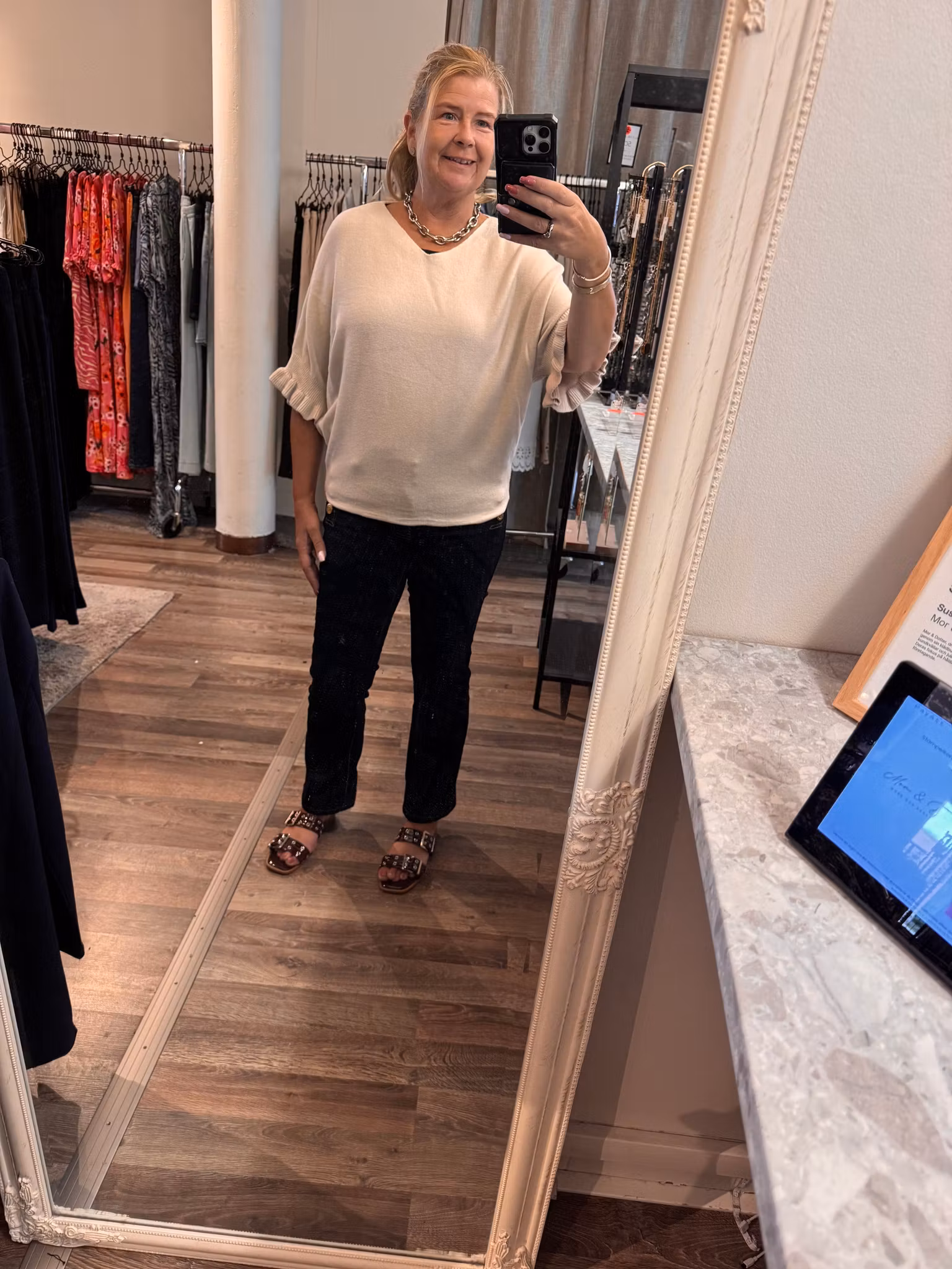 En supermjuk och skön stickad tröja som är i onesize som passar stl 34/36-42. Den är V-halsad, har 3/4 ärm med en fin volangdetalj och sitter snyggt över höfterna. Det är pingvinärmar och är lite avsmalnande nedtill så lätt att bara vika upp för midjemått modell när det önskas.