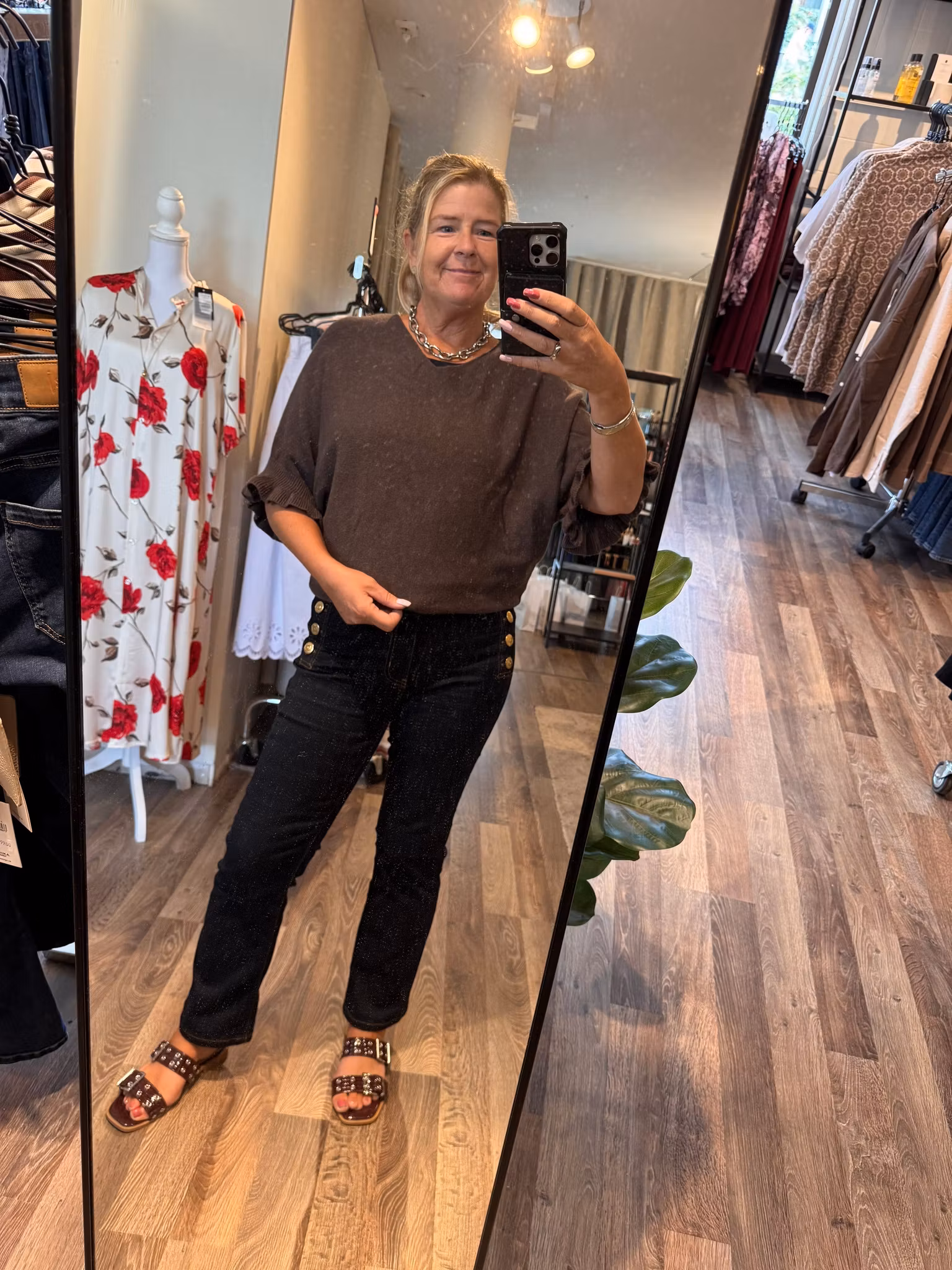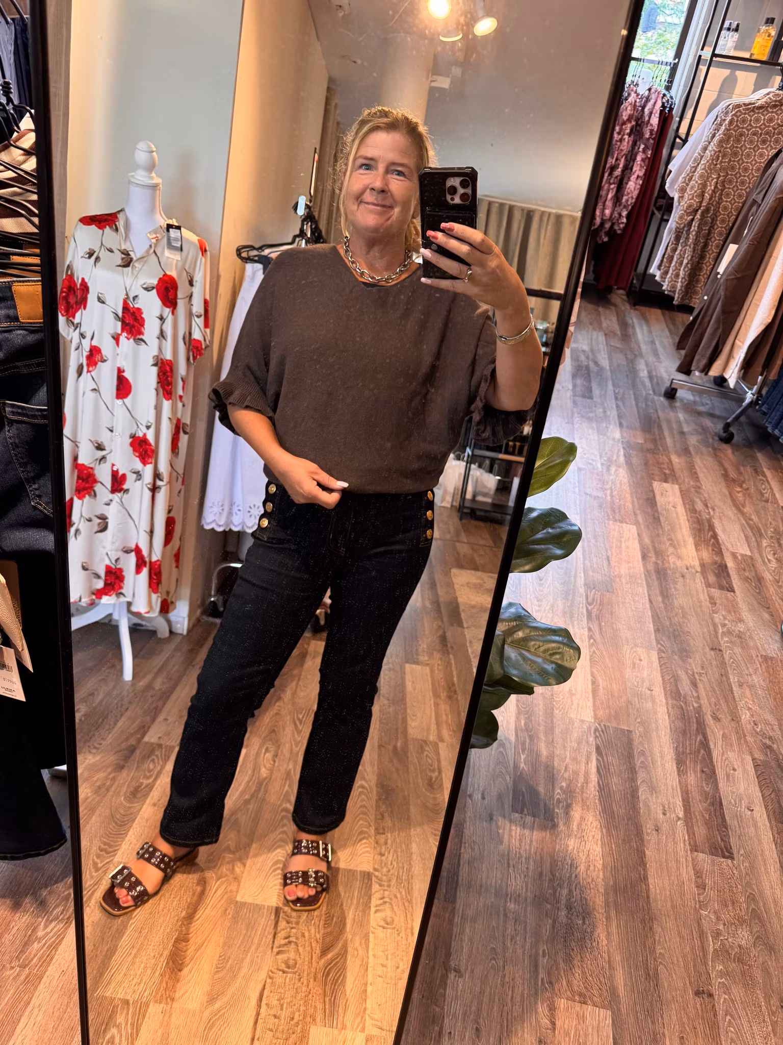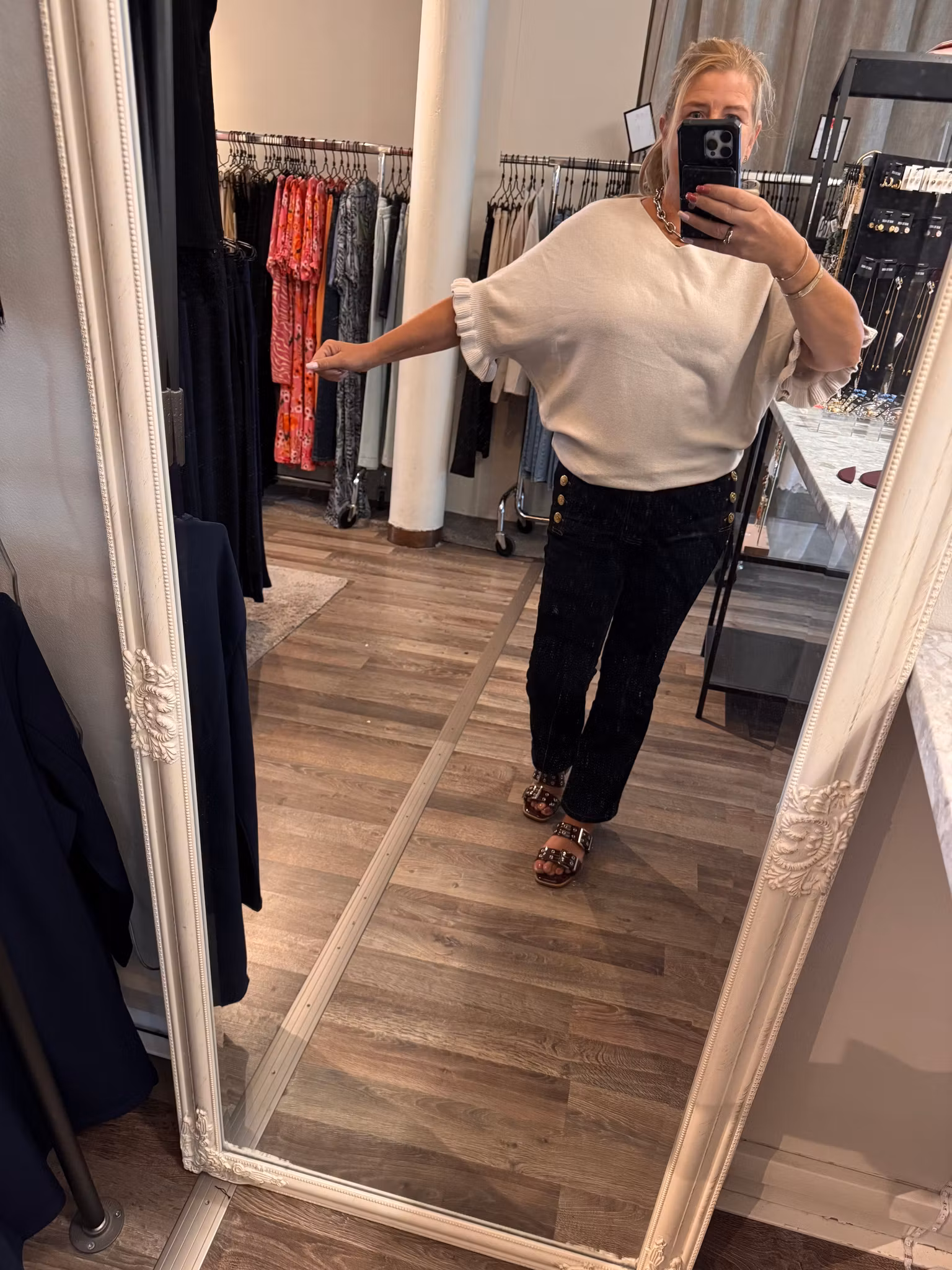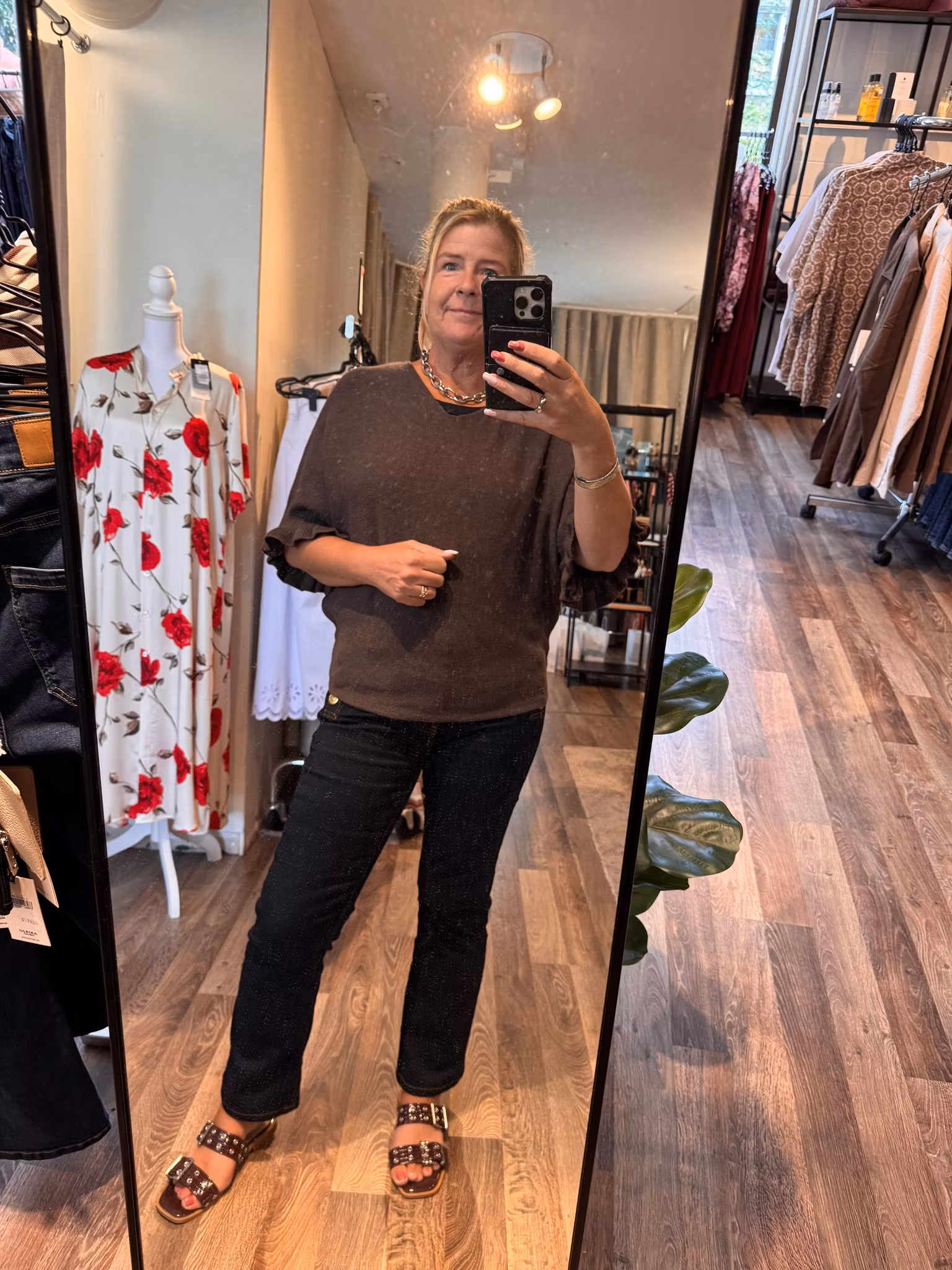 En supermjuk och skön stickad tröja som är i onesize som passar stl 34/36-42. Den är V-halsad, har 3/4 ärm med en fin volangdetalj och sitter snyggt över höfterna. Det är pingvinärmar och är lite avsmalnande nedtill så lätt att bara vika upp för midjemått modell när det önskas.