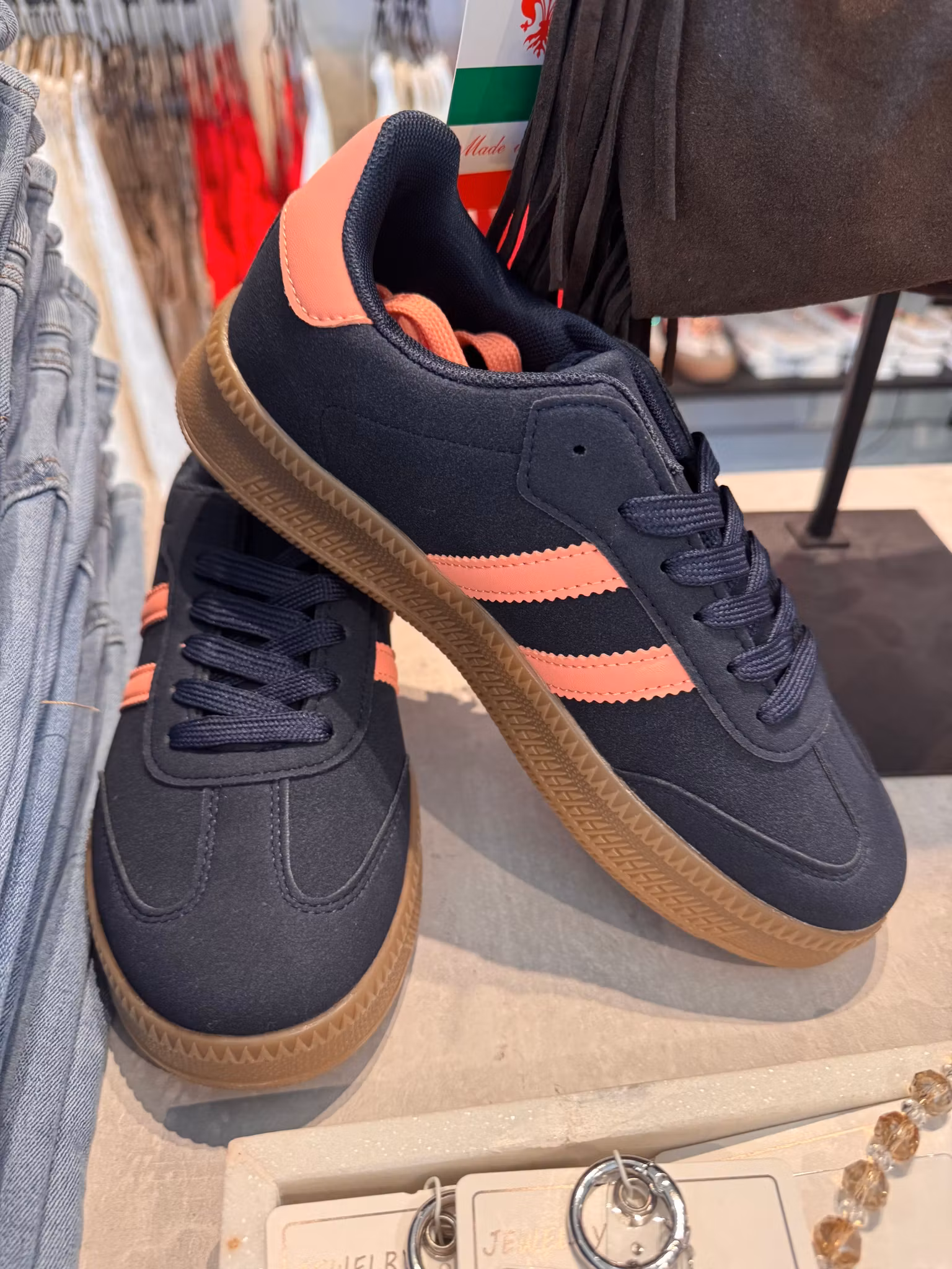 Sneakers med en ljusbrun gummisula, två streck på sidan och en baksidan på hälen i laxrosa. Marinblåa skosnören som sitter på och sen får man med laxrosa också om man vill byta. På sulan är det små pluttar framtill som ger skön komfort. Normala i storleken.