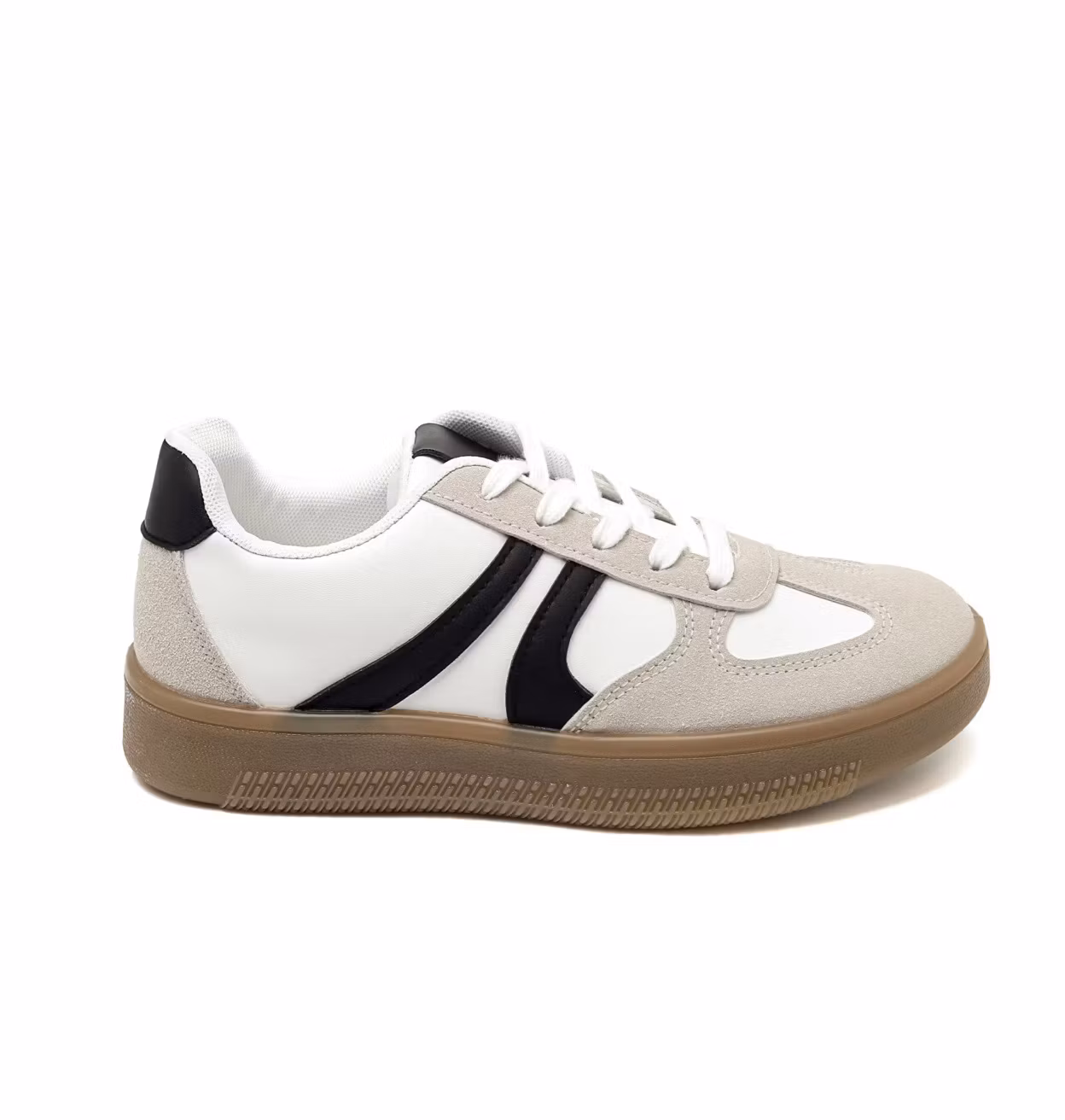 Sneakers med en ljusbrun rågummisula, två streck på sidan och en baksidan på hälen i svart skinnimitation. Sandfärgad mockaimitation och vit skinnimitation på skon. På den urtagbara sulan är det små pluttar framtill som ger skön komfort. Normala till rymliga i storleken. Pendlar du ta din mindre.