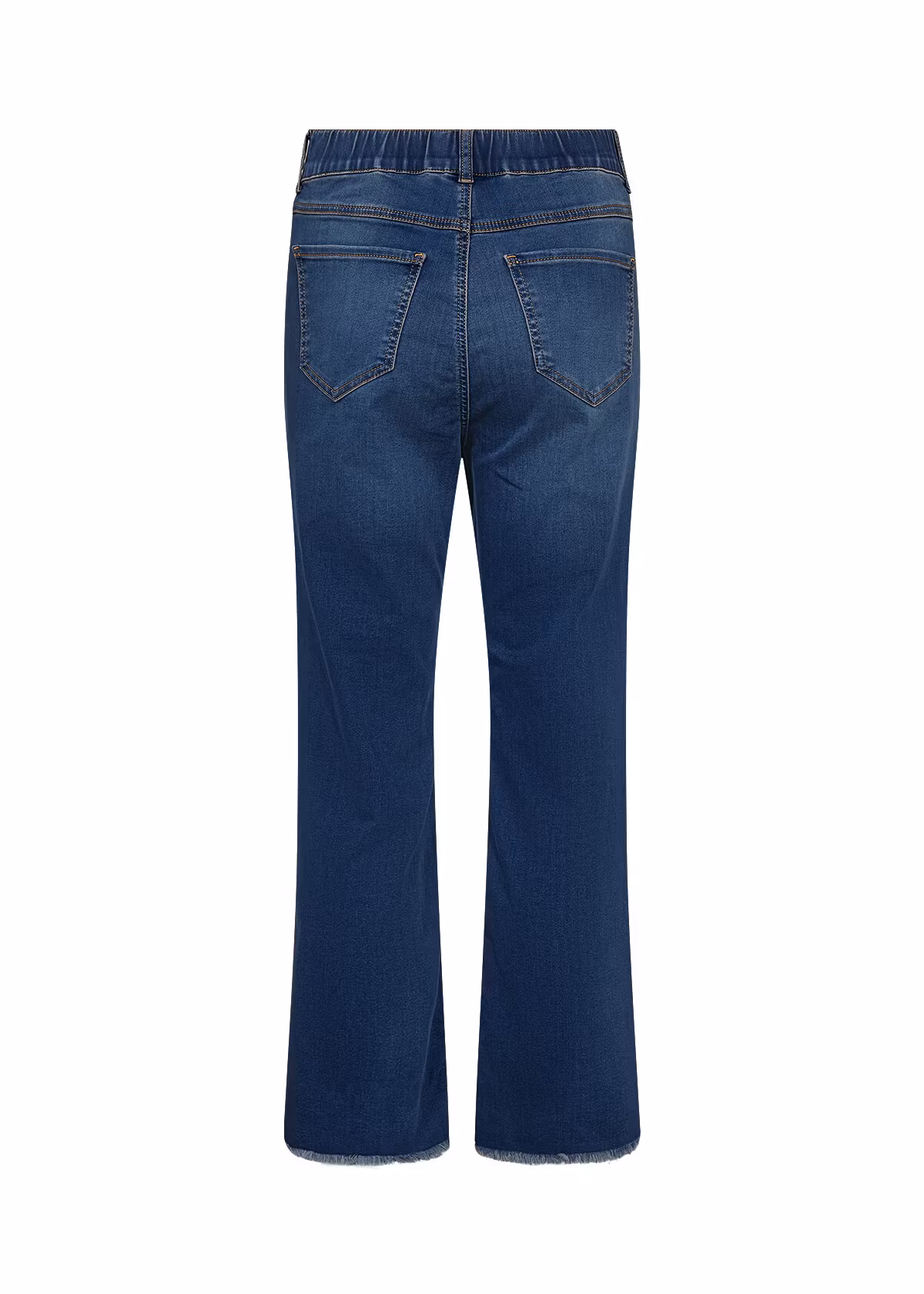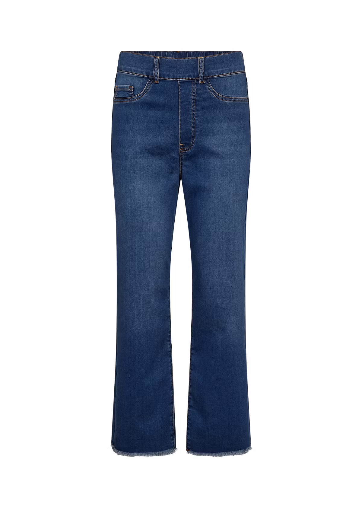 En stretchig jeansbyxa i dra-på-form i ankellängd. Känns som jeggings. De har resår i midjan och hällor för bälte. Fickor bak och dekorationsfickor fram, något