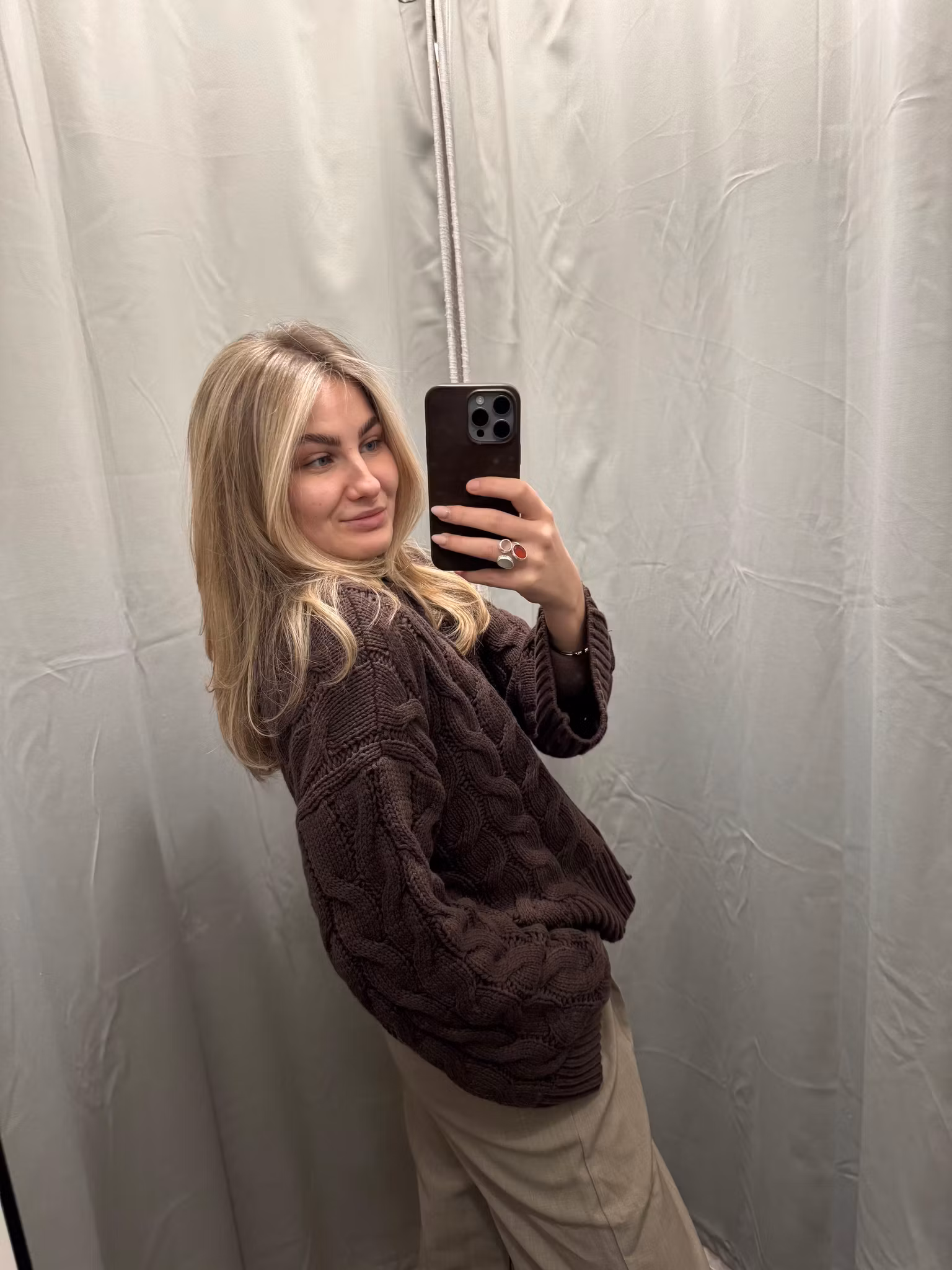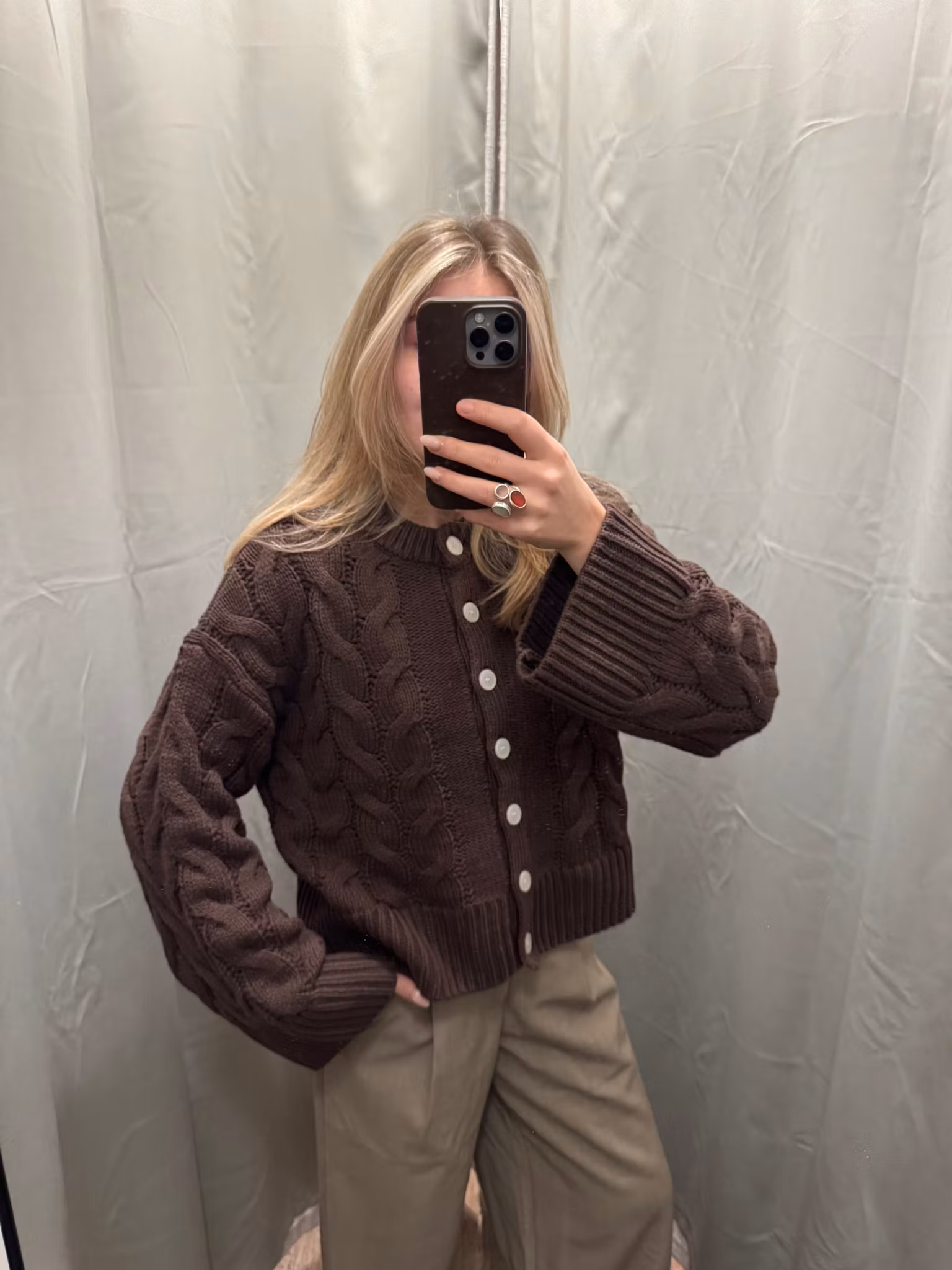 En kabelstickad kofta i rejäl kvalitet med super fint mönster i stickningen. Kotan är höftlång, har fina trumpetärmar, rundhalsad och ljusa knappar framtill. Den är rymlig i kroppen men pendlar du i storlek och vill ha lite längd ta din större storlek.