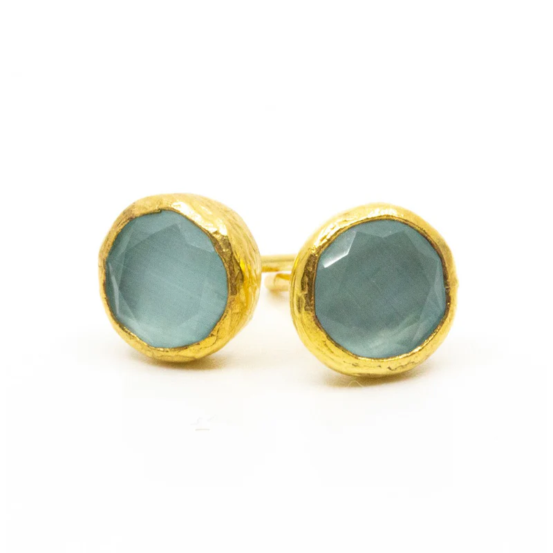 Örhängespar i mässing som förgyllts med 18 karat guld. Stenen är av syntetisk cats eye som görs genom en unik glasteknik.