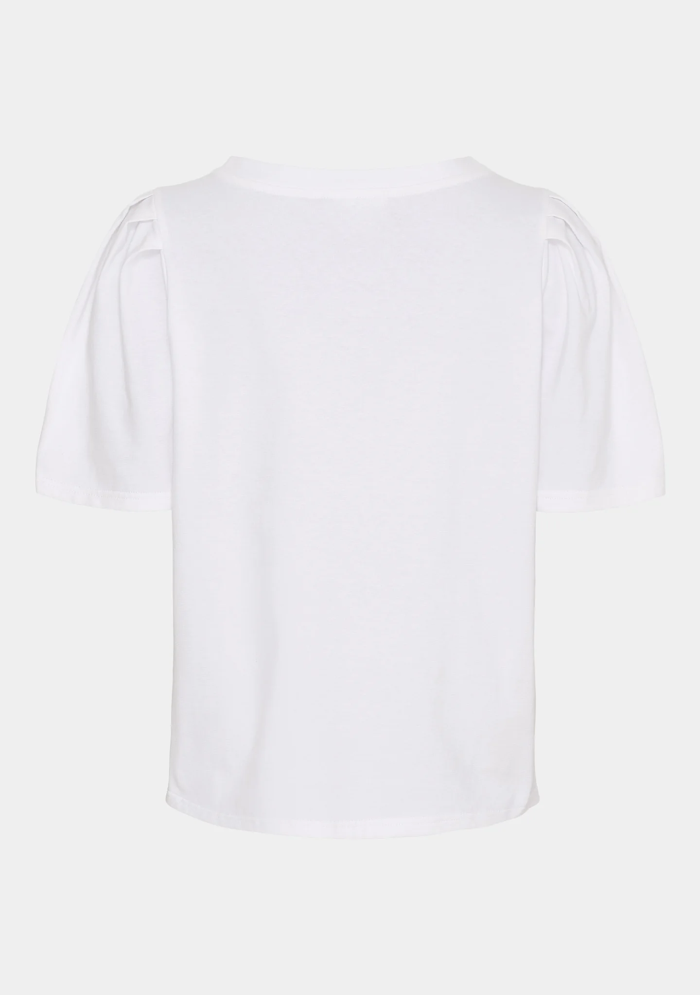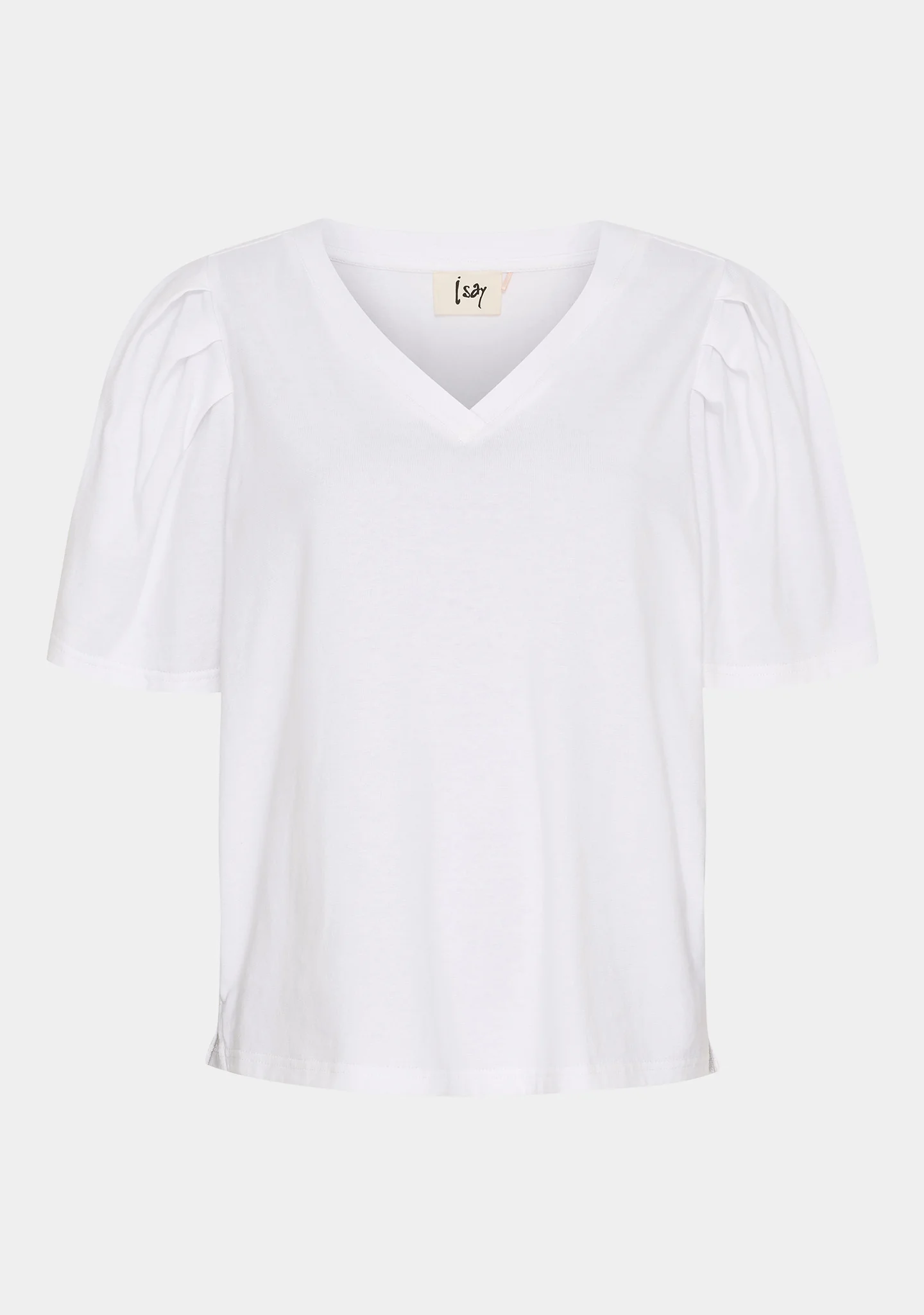 En rolig v-ringad bas t-shirt med puffärmar. Den är tillverkad i mjuk och tjock bomullskvalitet med en liten sprund i varje sida. Den kan stylas med allt i din garderob, men är särskilt fin till ett par denimjeans för en avslappnad vardagslook eller en lång kjol för fest.