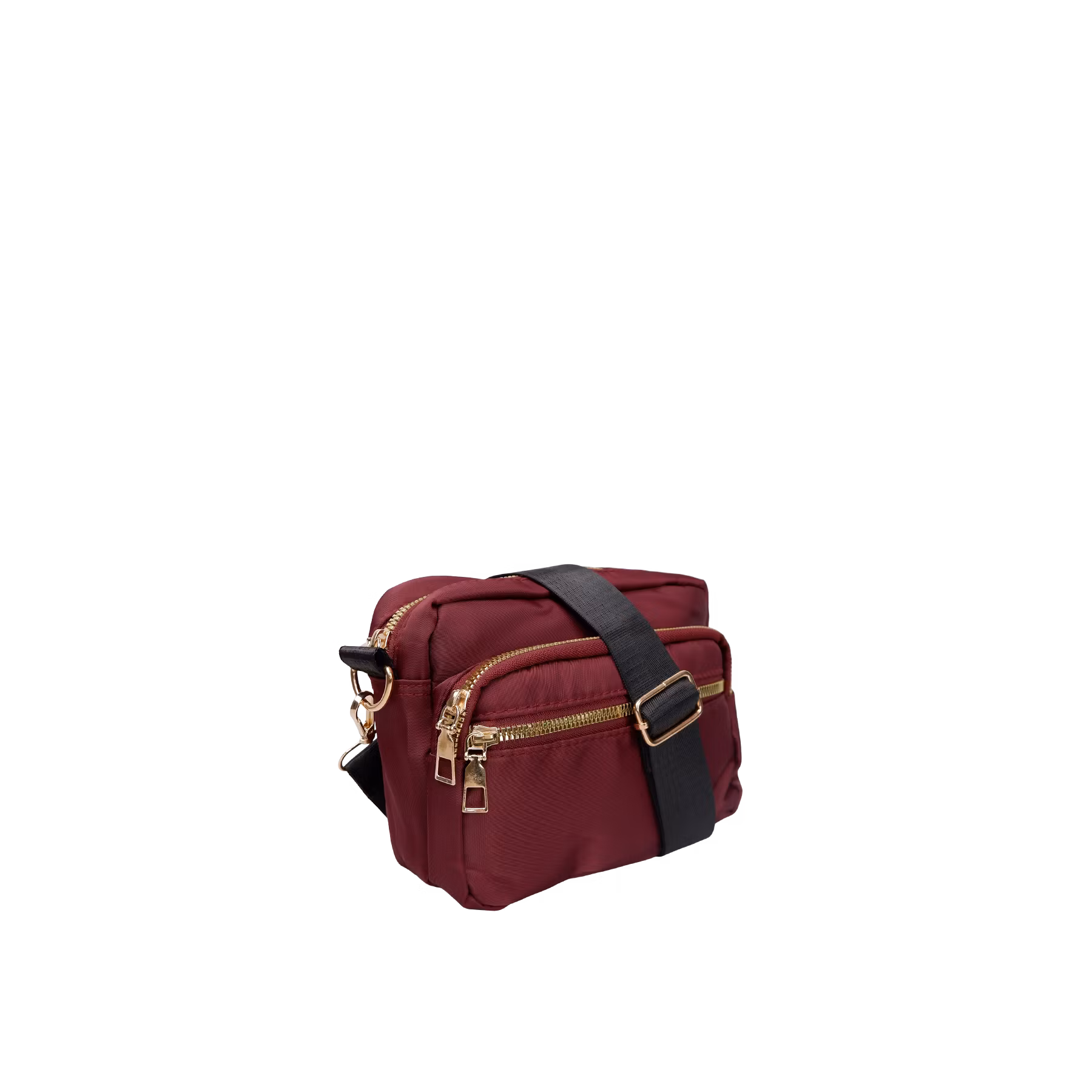 Liten nylon väska med två framfickor och sen ett stort fack. Denna rymmer mycket men är i ett litet format. Kommer med en justerbar axelrem som går att ta av om man vill byta ut den. Alla metaller är i guld och remmen är svart.